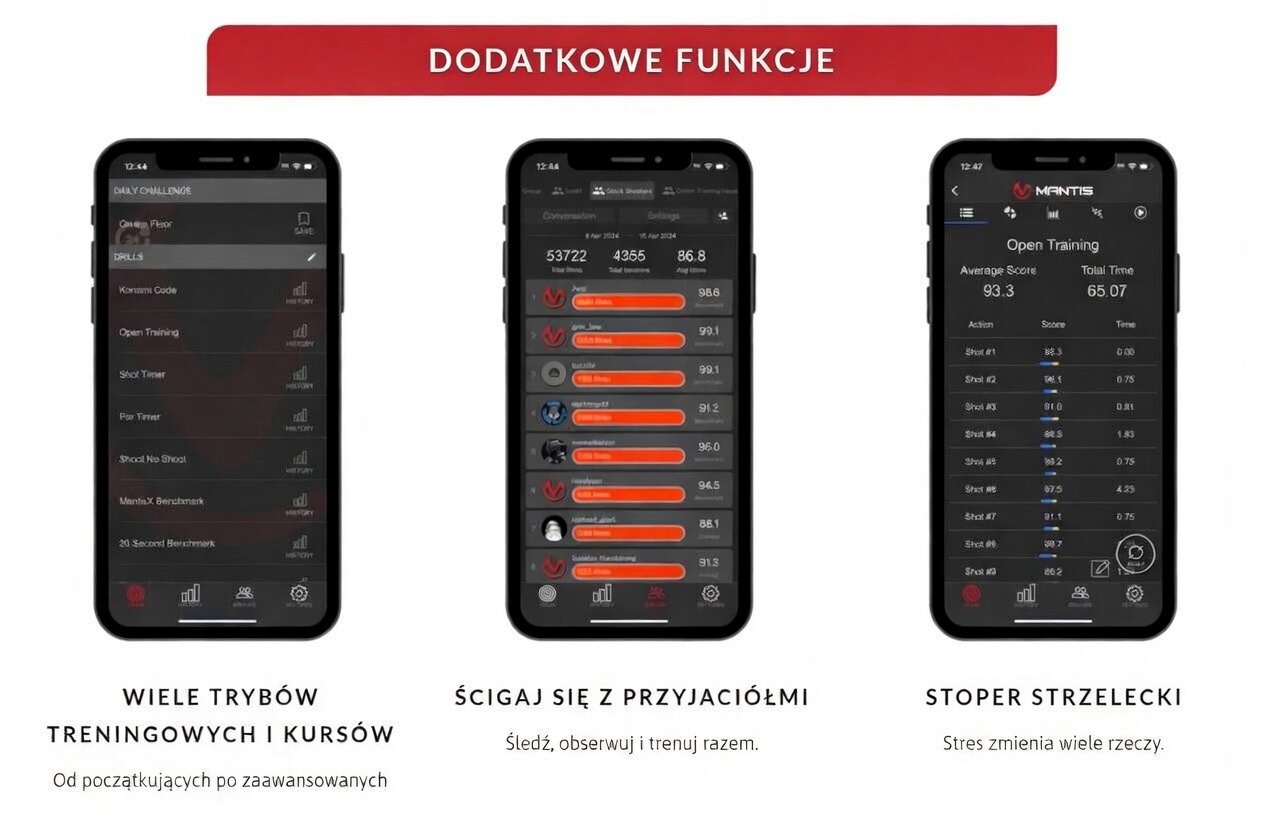 The device is mounted on a Picatinny rail or on a dedicated adapter and synchronizes via Bluetooth with a smartphone or tablet equipped with the MantisX app (available for free download from Google Play or AppStore). The app offers, among other things: analysis and recording of weapon movements during shooting, multiple training modes, a variety of configuration options, and the ability to use the trainer both during dry fire training and with live ammunition at the shooting range.