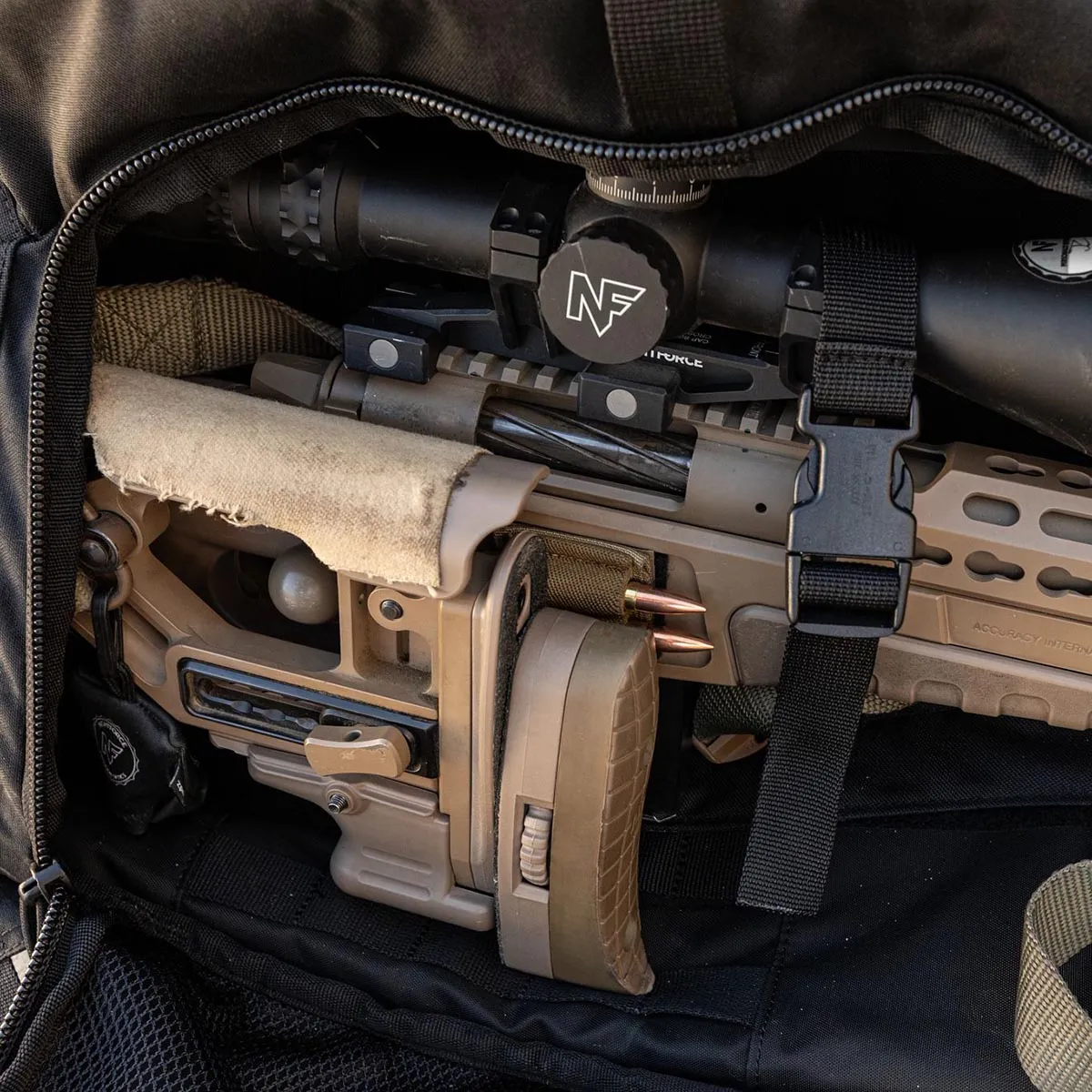 A unique feature of this model is the split-center design, which means that the backpack has two separate zones — on one side, there is a designated space for long-barreled weapons (e.g., a folding precision rifle with a scope and suppressor), and on the other – space for a tripod, support equipment, or other gear. A semi-rigid, padded divider separates these zones and is equipped with a MOLLE platform, allowing for modular attachment of accessories. Four straps with quick-release buckles securely hold the weapon and gear during transport.