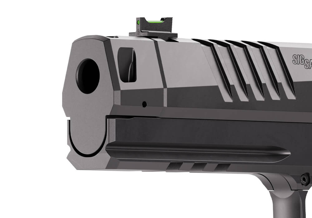 The pistol comes with full ambidextrous controls and is powered by P320 magazines. The sleek, full-size slide along with the accessory rail positively affects the balance of the firearm.