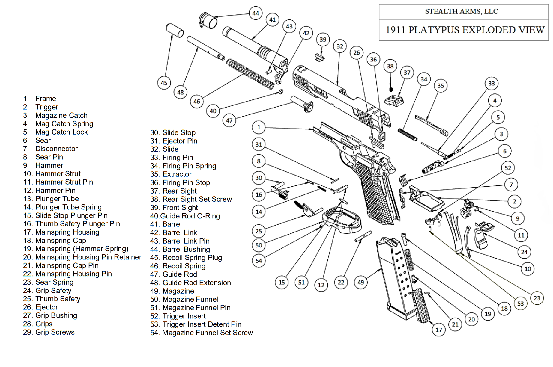 Platypus - Platypus - is one of the newest projects by Steath Arms. The model represents a group of pistols from the 1911 family powered by double-stack magazines. The main distinguishing feature of the Platypus is the ability to use magazines in the Glock standard. The pistol frame has been redesigned, the magazine well widened, but the manufacturer managed to achieve these changes while maintaining the original, comfortable grip angle of the 1911.